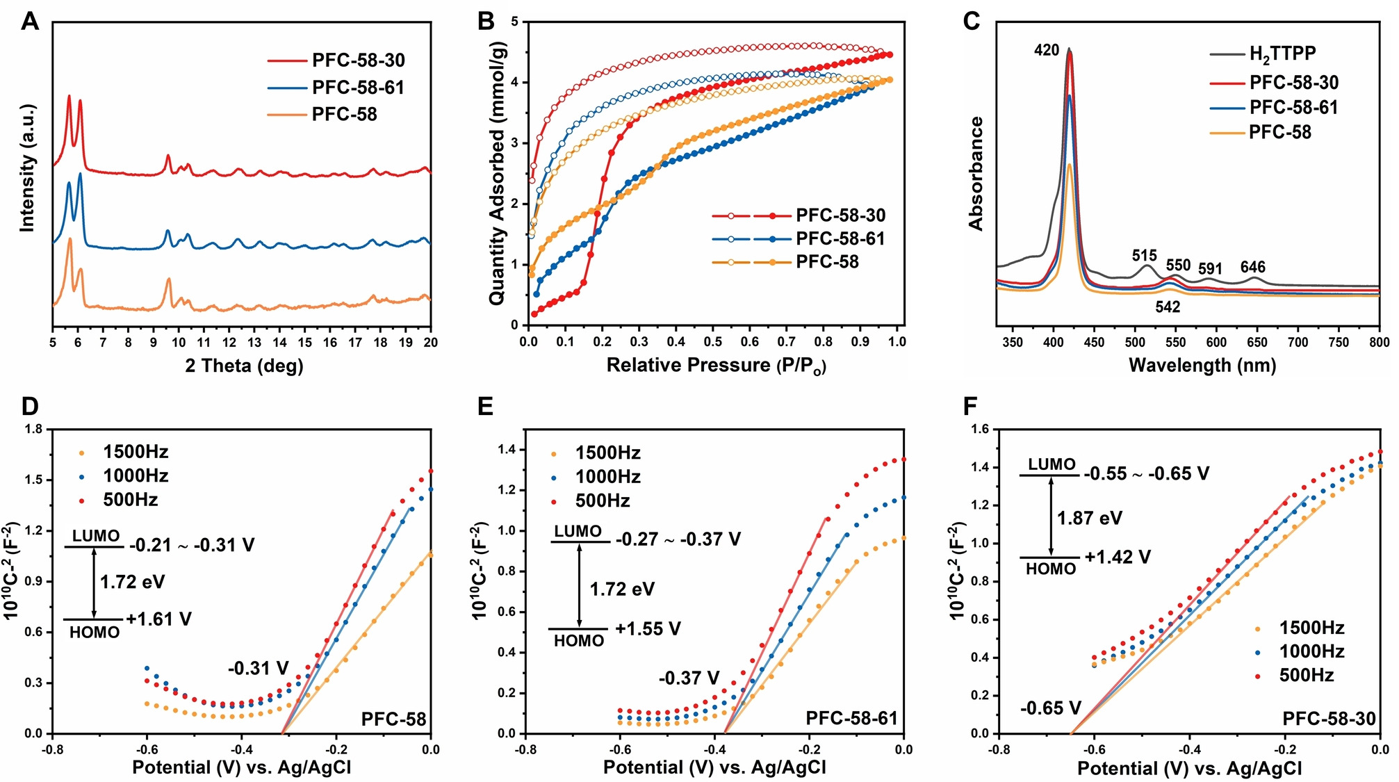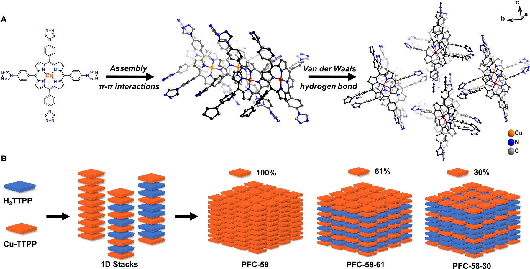 (1) 通过控制Cu-TTPP和H2TTPP的投料比,合成了一系列同构HOF材料PFC-58、PFC-58-61和PFC-58-30,金属卟啉含量分别为100%、61%和30%。进一步降低金属卟啉含量无法形成有序分子排列,只能得到无定形粉末样品。
