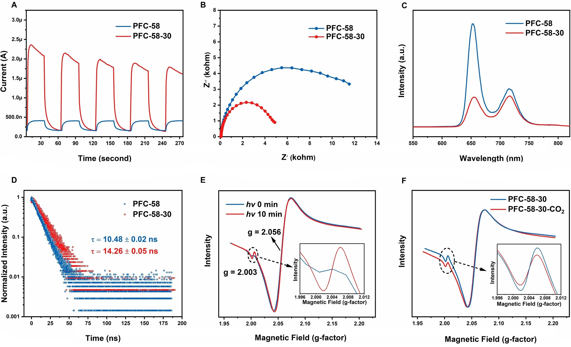 (2) 瞬态光电流响应测试表明PFC-58-30具有更高的光电流,电化学阻抗谱和荧光光谱也证实其具有更好的电导率、更快的电荷传输和更低的电子空穴复合。