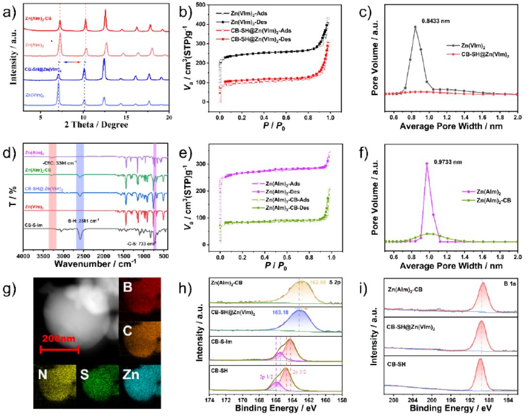 (1) 利用X射线光电子能谱(XPS)分析了CB-SH@Zn(VIm)2和Zn(AIm)2-CB的化学状态,结果显示CB-SH在Zn(AIm)2中的共价键合。
