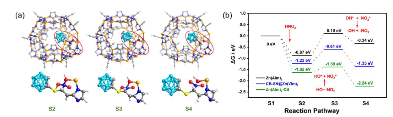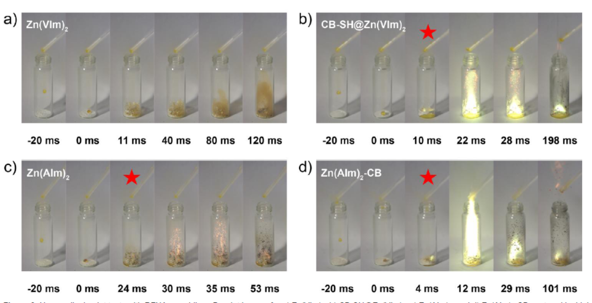 (1) 通过球磨法将CB-SH封装在Zn(VIm)2中,形成CB-SH@Zn(VIm)2,进而通过配体交换和原位点击反应成功将CB-SH固定在Zn(AIm)2骨架上,形成目标产物Zn(AIm)2-CB。这一策略使Zn(AIm)2的体积能量密度增加了46.6%,点火延迟时间从24毫秒降至4毫秒。