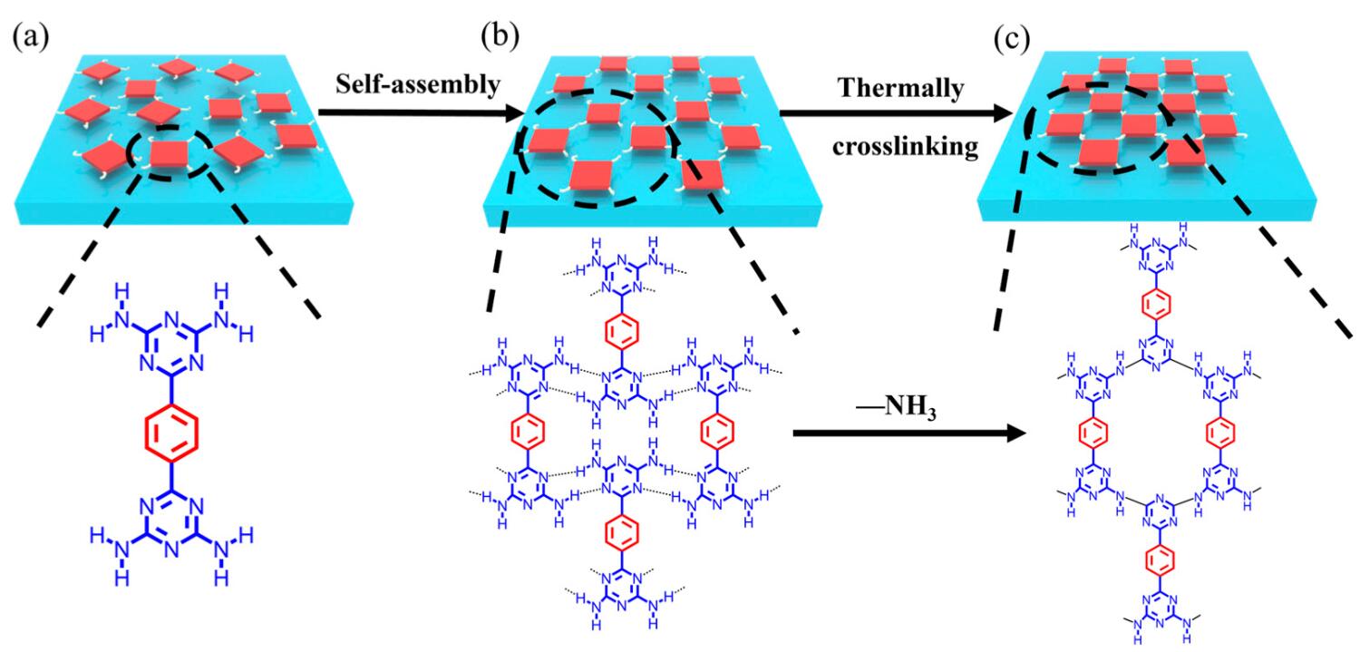 (3) 本文作者提出了一种简单易行的热交联方法,通过高温处理含二氨基三嗪(DAT)基团的HOF,使相邻HOF构筑块之间形成共价-NH-键,从而制备出高稳定性的热交联HOF材料。该方法合成简单,易于规模化制备。同时热交联HOF在离子分离膜领域展现出优异性能。