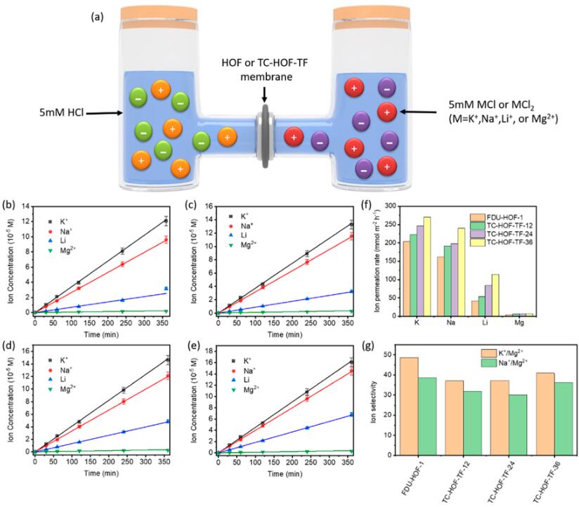 b. FDU-HOF-1和TC-HOF膜对K+/Mg2+的选择性高达30-50,对Na+/Mg2+的选择性为30-40,与商业化Nafion膜相当