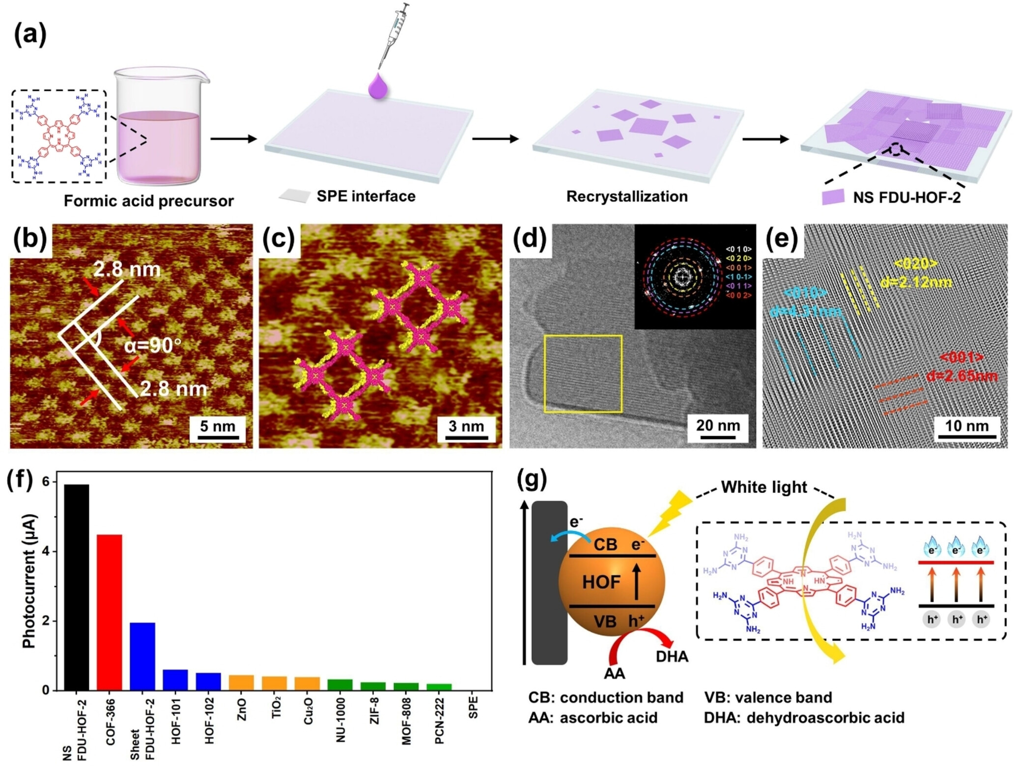 1)该工作报道了一种简单的溶液加工方法制备大面积、可控厚度的二维氢键有机框架材料FDU-HOF-2,并将其应用于光电化学检测二氧化碳。