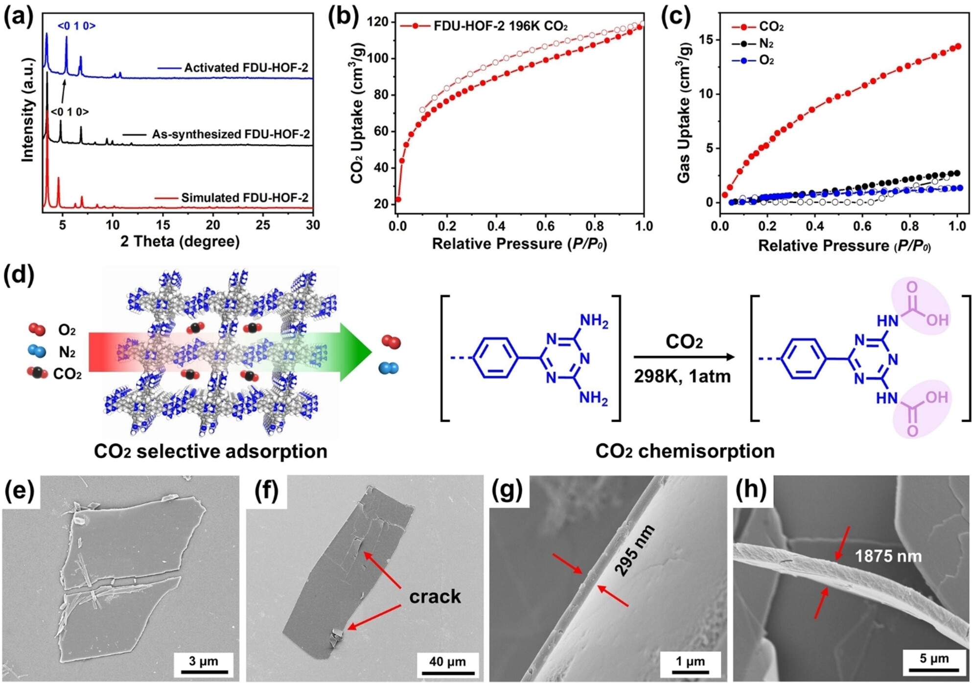 1)合成了基于卟啉和三嗪基团的氢键有机框架材料FDU-HOF-2,并通过X射线衍射、气体吸附等表征了其结构和微孔性质。