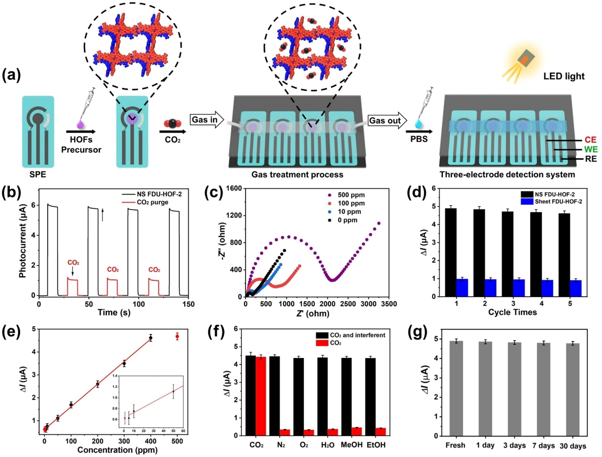 3)将FDU-HOF-2原位生长在电极表面,制备了光电化学传感器,并测试了其对二氧化碳的响应性能,包括检测范围、检测限、选择性、重复使用性能和长期稳定性等。