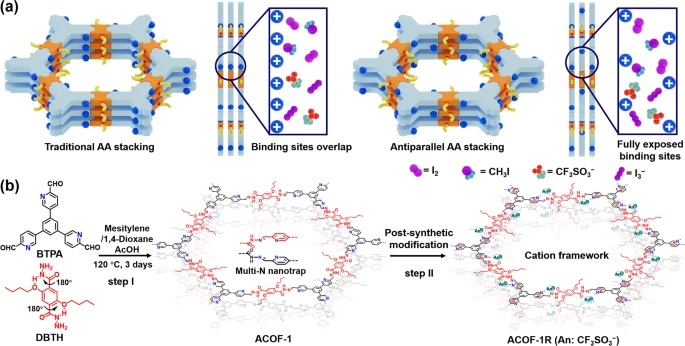 (3) 作者提出利用共价有机框架(COF)的独特孔环境,通过引入特定的结合基团(如吡啶-N、疏基团等),实现对不同碘物种的高效识别和动态捕获。合成了ACOF-1及其阳离子衍生物ACOF-1R,利用层间"多-N纳米陷阱"位点增强对I2、CH3I和I3-的亲和力。
