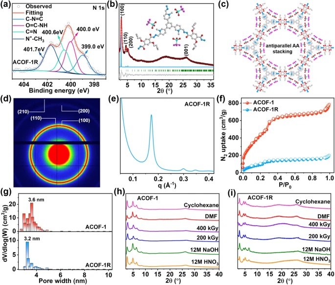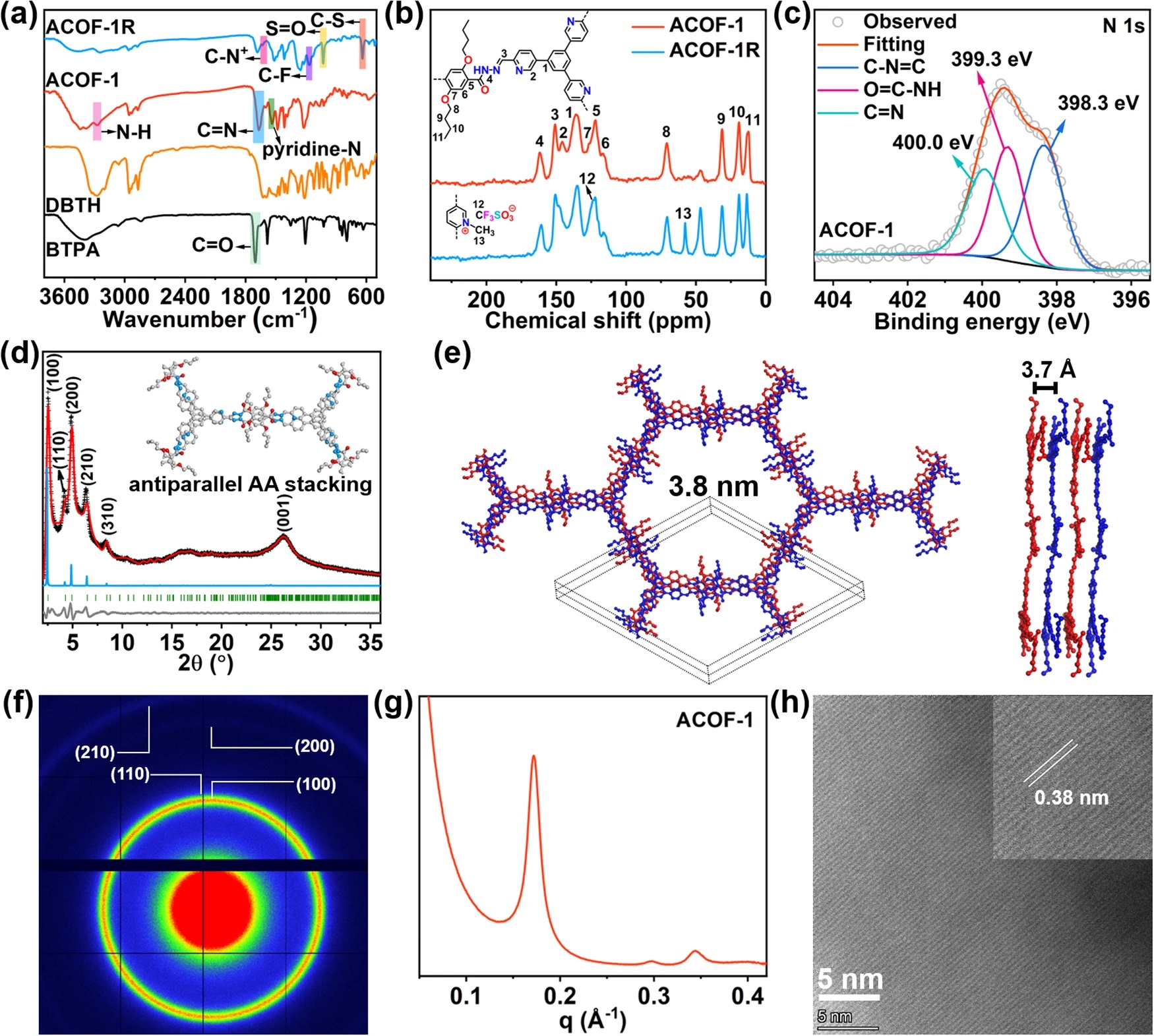 (1) 合成了中性ACOF-1和阳离子ACOF-1R,并通过多种表征手段(XRD、FT-IR、NMR、XPS等)确认了它们的结构。