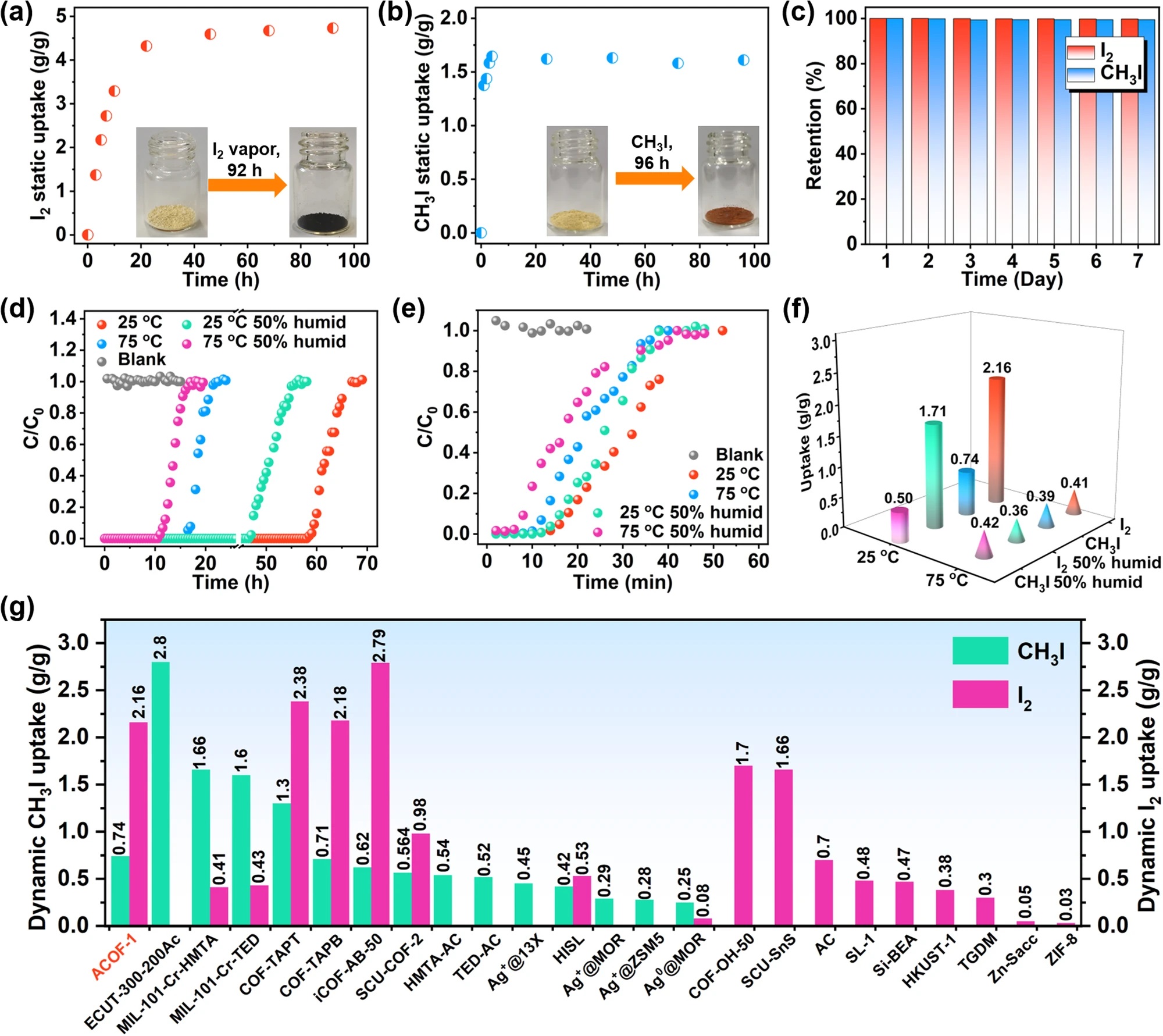 (3) 通过固定床层析实验,评估了ACOF-1在不同温度和湿度条件下对I2和CH3I的动态捕获能力。在25°C时,ACOF-1对I2和CH3I的动态吸附容量分别高达2.16g/g和0.74g/g,远超大多数报道的吸附剂。