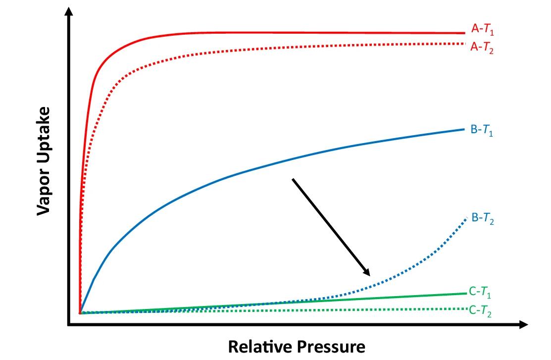 3)在30、60、90°C下测试C6环烃在Mn-DHBQ上的动态吸附等温线。结果与静态吸附实验一致,C6H12在60、90°C下基本被排除,C6H10在90°C下吸附量很小。