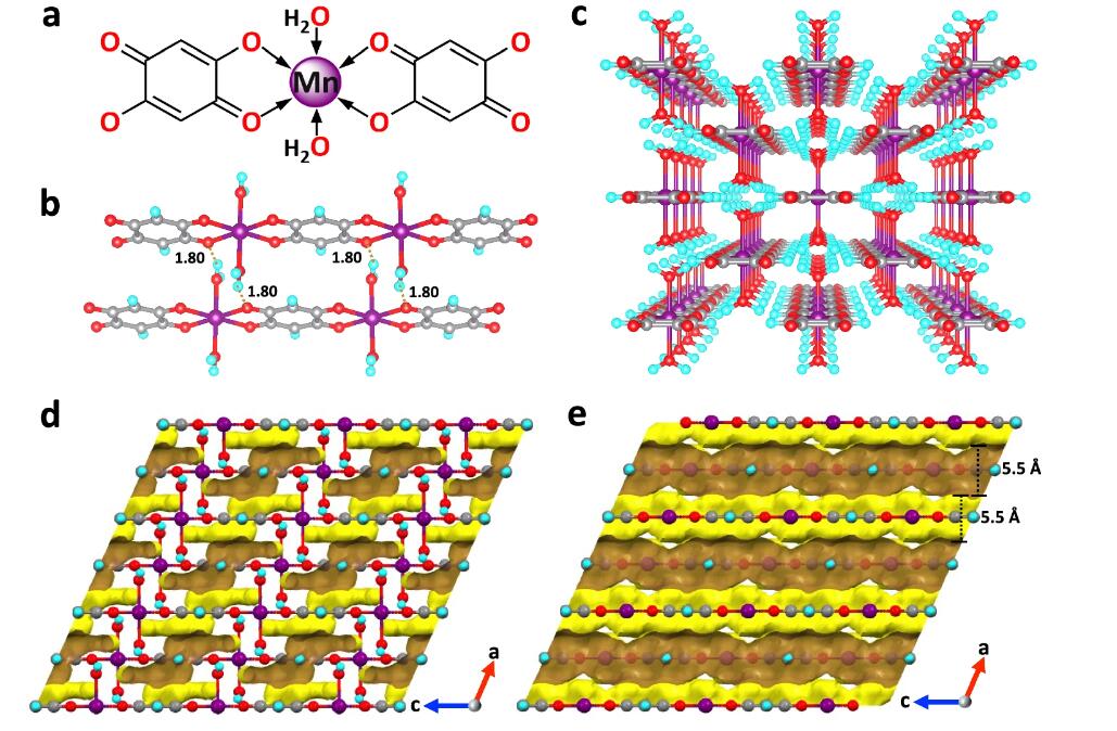 1)合成Mn-DHBQ:由锰乙酸盐和2,5-二羟基-1,4-苯醌在水溶液中室温反应过夜制备。将制备的Mn-DHBQ在150°C真空条件下活化,去除配位水分子,进行活化。