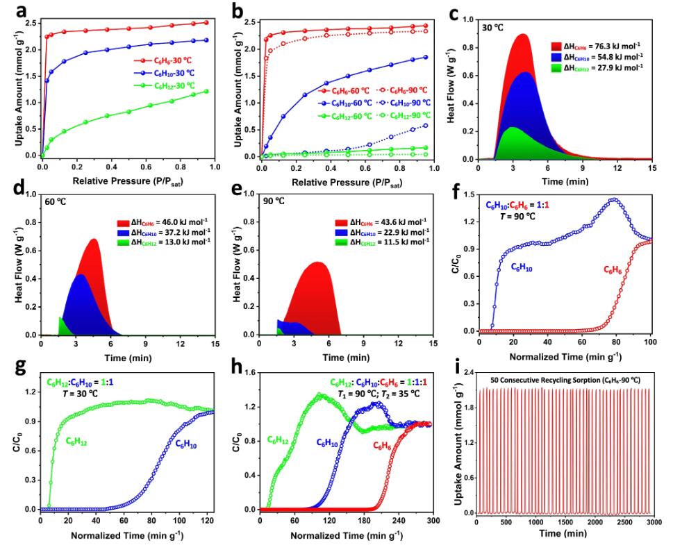 2)它展现出独特的温度和吸附剂依赖吸附行为,在气相中具有创纪录的C6H6/C6H12和C6H10/C6H12吸附比,在液相中具有最高的二元和三元选择性。