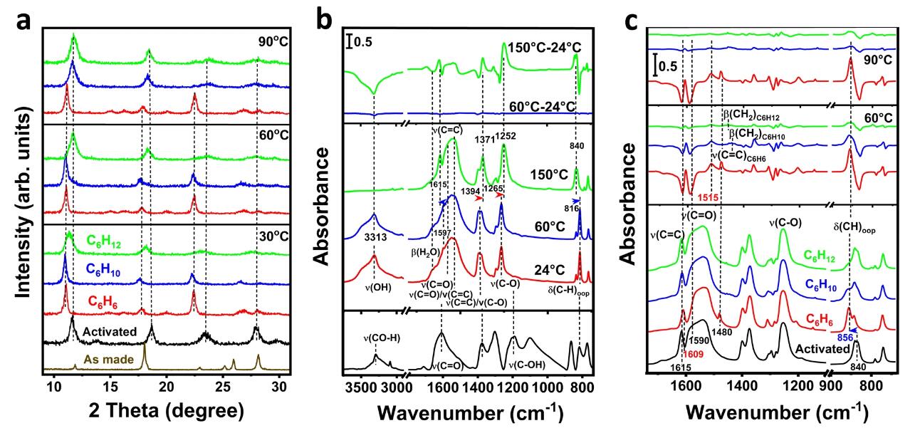 4)热流测量:通过差示扫描量热法测量不同温度下C6环烃在Mn-DHBQ上的吸附焓值,结果与观察到的温度依赖吸附行为一致。