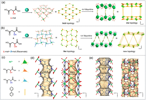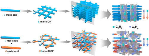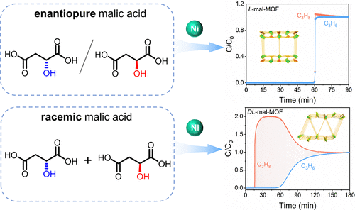 (3) 本文作者提出了一种配体外消旋策略,利用对映纯和外消旋的苹果酸配体构筑了两种同构的镍基MOF。外消旋配体dl-mal-MOF形成了周期性收缩-扩张的准离散孔道,有望增大丙烯和丙烷在扩散速率上的差异,同时氧原子丰富的孔环境和与客体分子尺寸相当的孔径可增强对客体分子的结合亲和力和微孔限域效应,协同提升丙烯/丙烷的热力学和动力学分离性能。