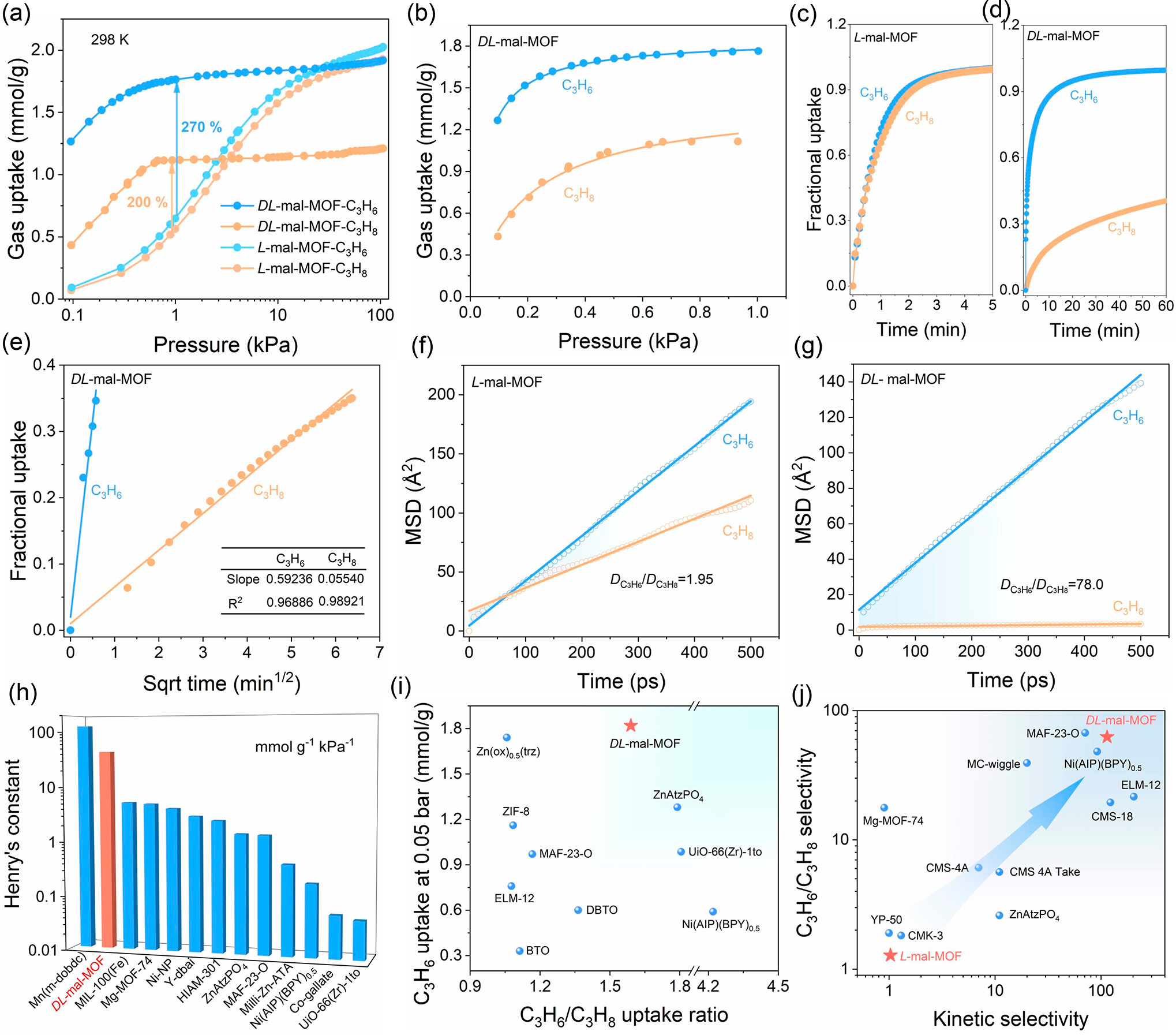 (1) 在0-1.0 kPa压力范围内,dl-mal-MOF对丙烯和丙烷的Henry常数分别为43.6和7.44 mmol g⁻¹ kPa⁻¹,Henry选择性高达5.86,远高于l-mal-MOF的1.2,证实了配体外消旋策略增强了热力学吸附性能。