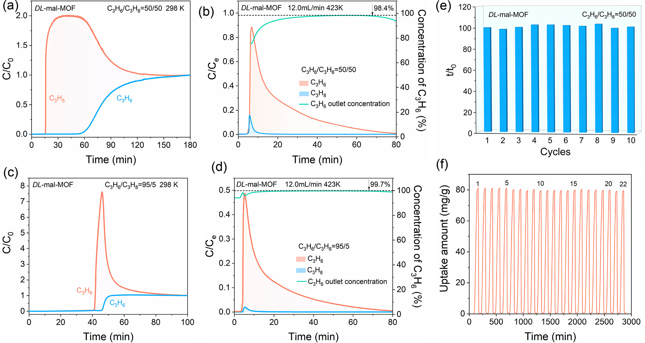 (5) 突破实验表明,dl-mal-MOF能高效分离丙烯/丙烷混合物(50/50和95/5),并以2.1 L/kg的速率回收纯度>99.5%的聚合级丙烯。多次循环实验和再生性测试证实了dl-mal-MOF优异的稳定性和再生能力。