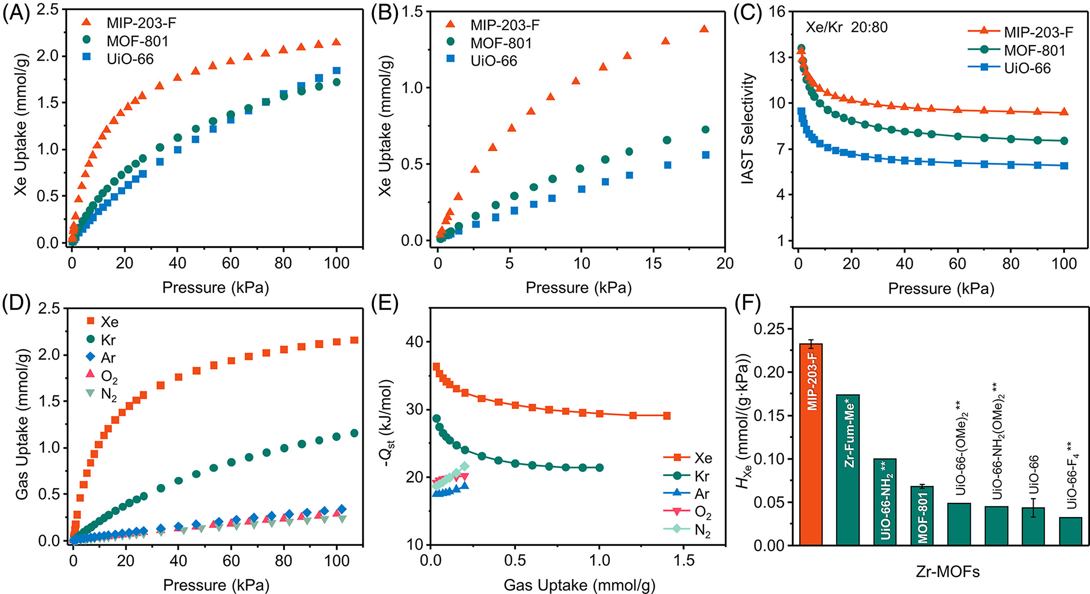 实验结果表明,MIP-203-F具有更高的氙吸附量、亨利系数和氙/氪选择性,在穿透实验中表现出优异的氙/氪分离和稀释氙捕集能力,优于现有的Zr基MOF材料。
