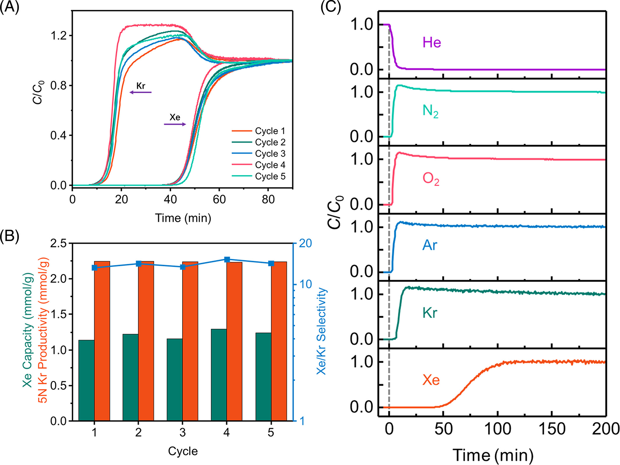 (4) 开展了动态柱穿透实验,考察了MIP-203-F对氙/氪混合气体和稀释氙/氪的分离捕集性能。