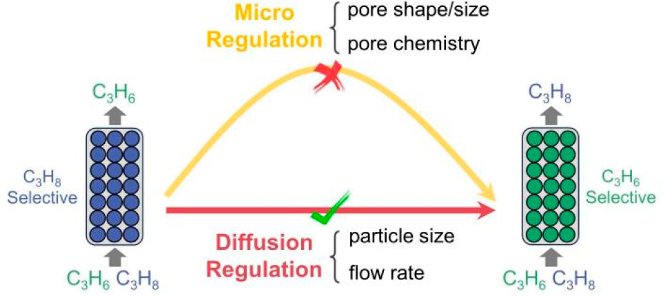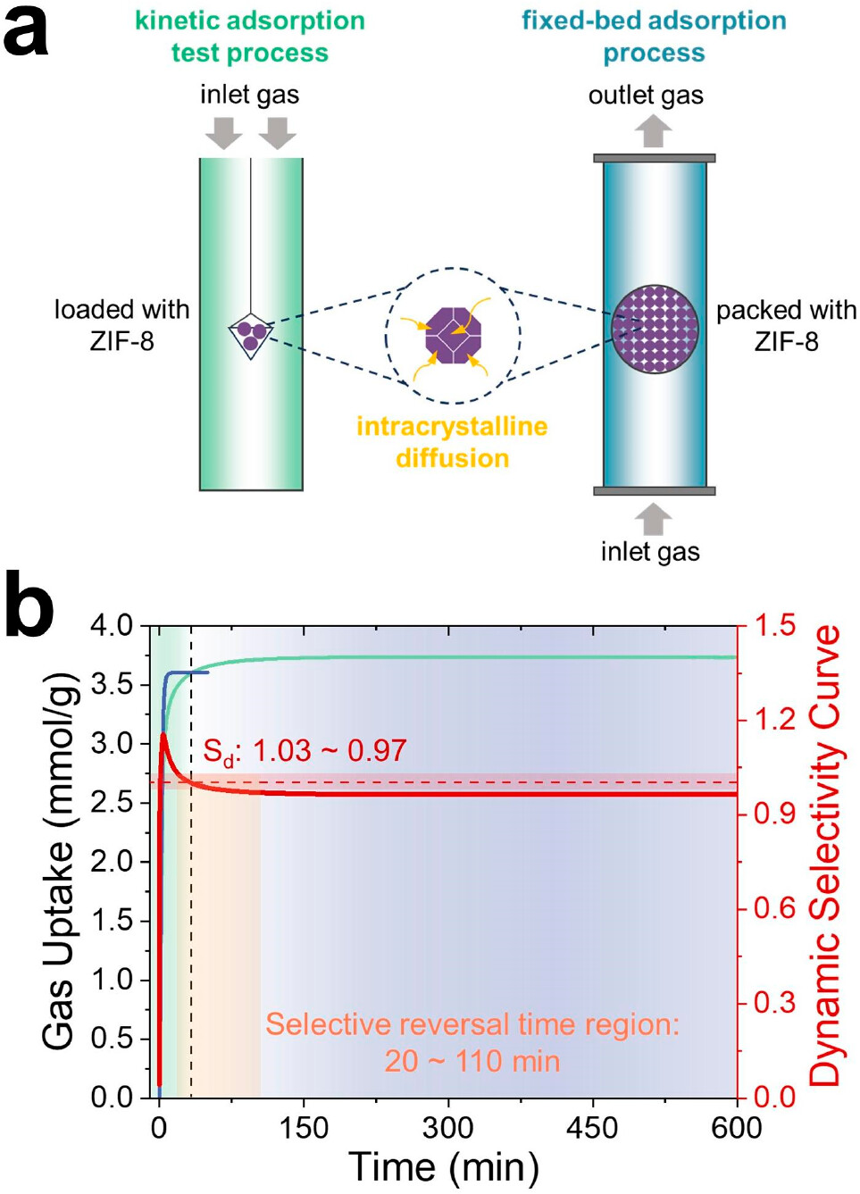 本研究通过系统改变ZIF-8颗粒尺寸和气体流速,在实验和模拟中完全反转了丙烯/丙烷的吸附选择性。