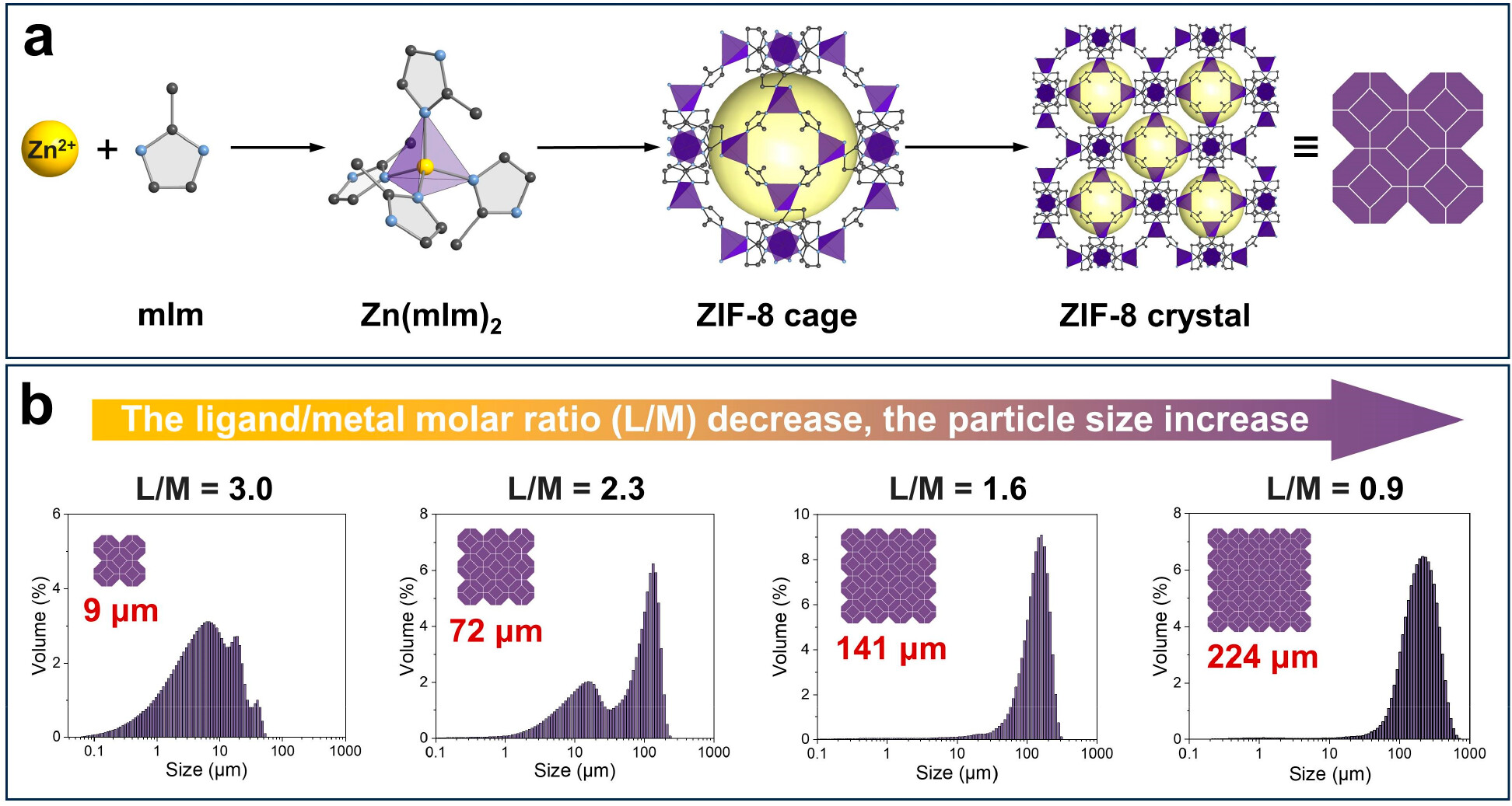 1)合成了一系列平均粒径从9到224μm的ZIF-8样品,发现降低配体/金属摩尔比可以增加ZIF-8颗粒尺寸。不同尺寸的ZIF-8样品都表现出高结晶度,但颗粒越大,比表面积越小。