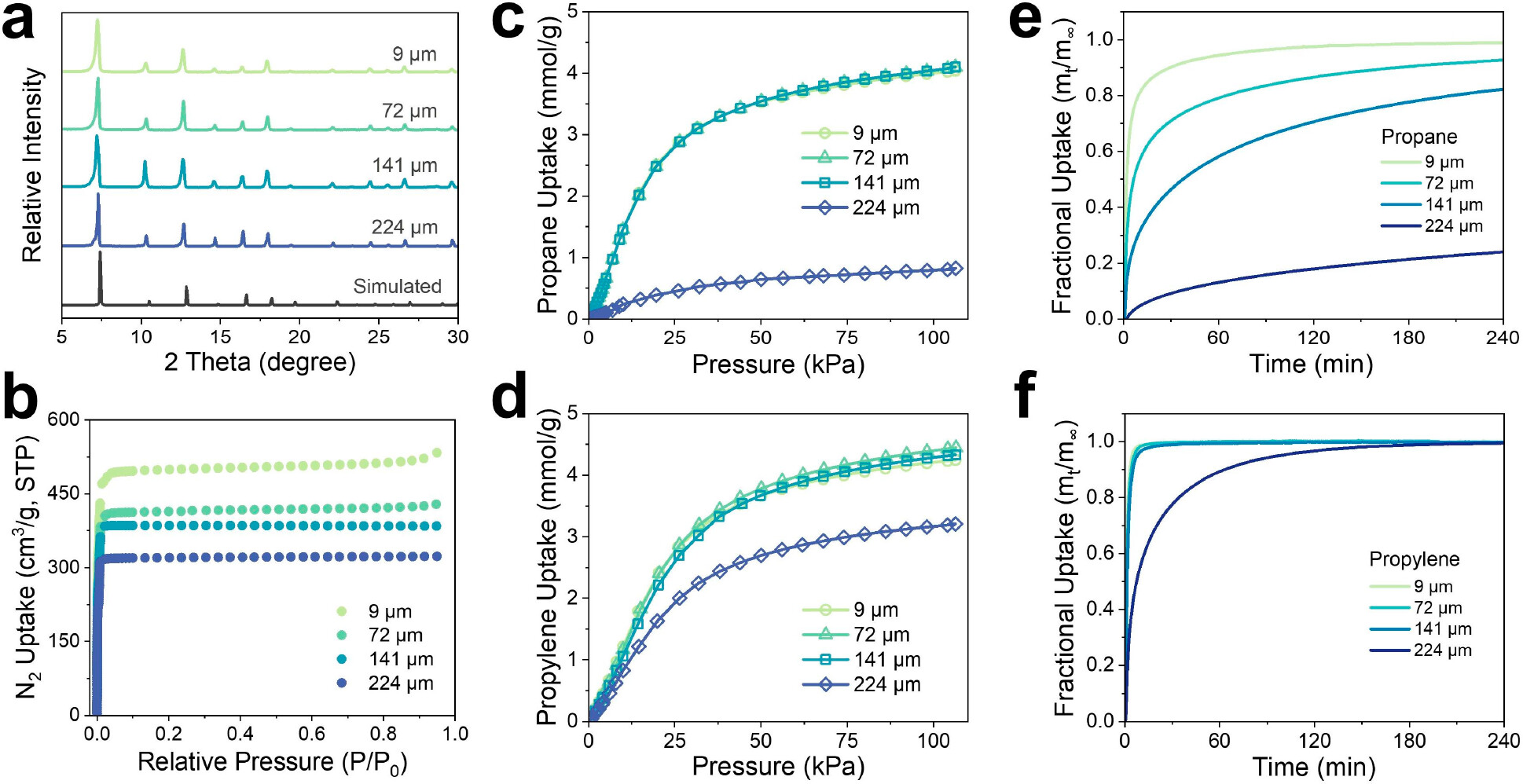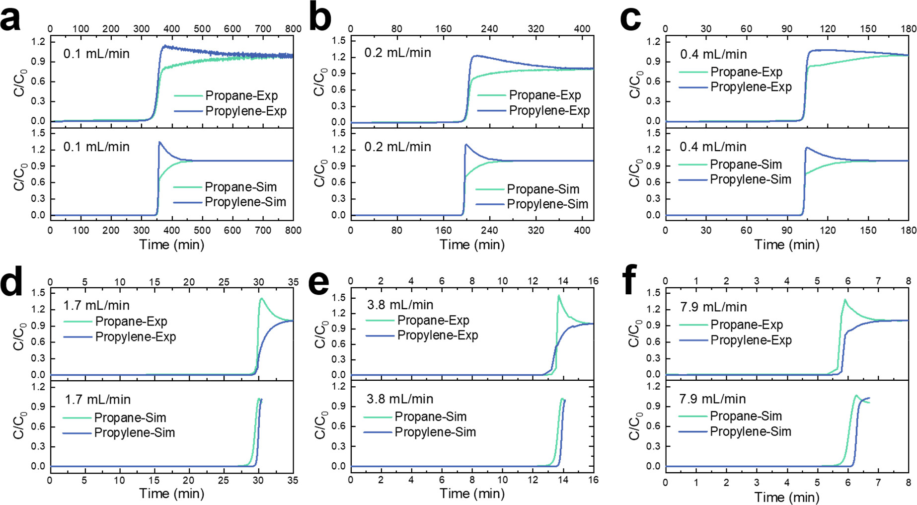 3)进行了一系列固定床突破实验和模拟。随着颗粒尺寸增大,丙烯/丙烷的突破选择性从0.9(ZIF-8-9μm)上升到2.0(ZIF-8-224μm),实现了吸附反转。在ZIF-8-9μm上,随着流速从0.1ml/min增大到7.9ml/min,丙烯/丙烷选择性也从0.9提高到1.1。