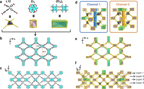 (3) PCN-999沿a轴显示出分级多孔结构,包括一维六角形介孔通道(~22 Å)和一维菱形微孔通道(~12 Å)。