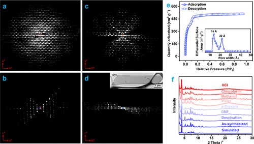 (2) 热重分析和变温XRD表明PCN-999具有高达~450°C的分解温度和在~280°C发生相变,脱溶剂后晶化度保持良好。浸泡实验表明PCN-999在DMF、对二甲苯、水、甲醇、氯仿和pH=1盐酸溶液中24小时后晶化度保持,具有优异的化学稳定性。