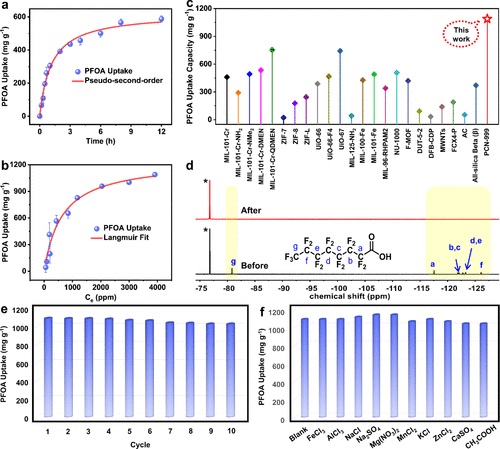 (4) 开放配位点、分级多孔结构以及优异的水解、热和化学稳定性的协同作用,使PCN-999在水中表现出前所未有的PFOA吸附容量(1089 mg/g, 2.63 mmol/g)。