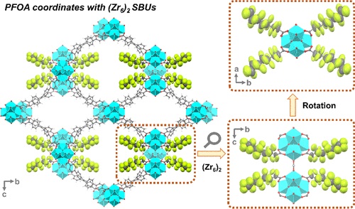 (2) (Zr6)2簇由两个甲酸根桥连的两个Zr6簇组成,专门与不对称配体的短臂相连,在MOF骨架中引入额外的开放配位点以容纳PFOA。