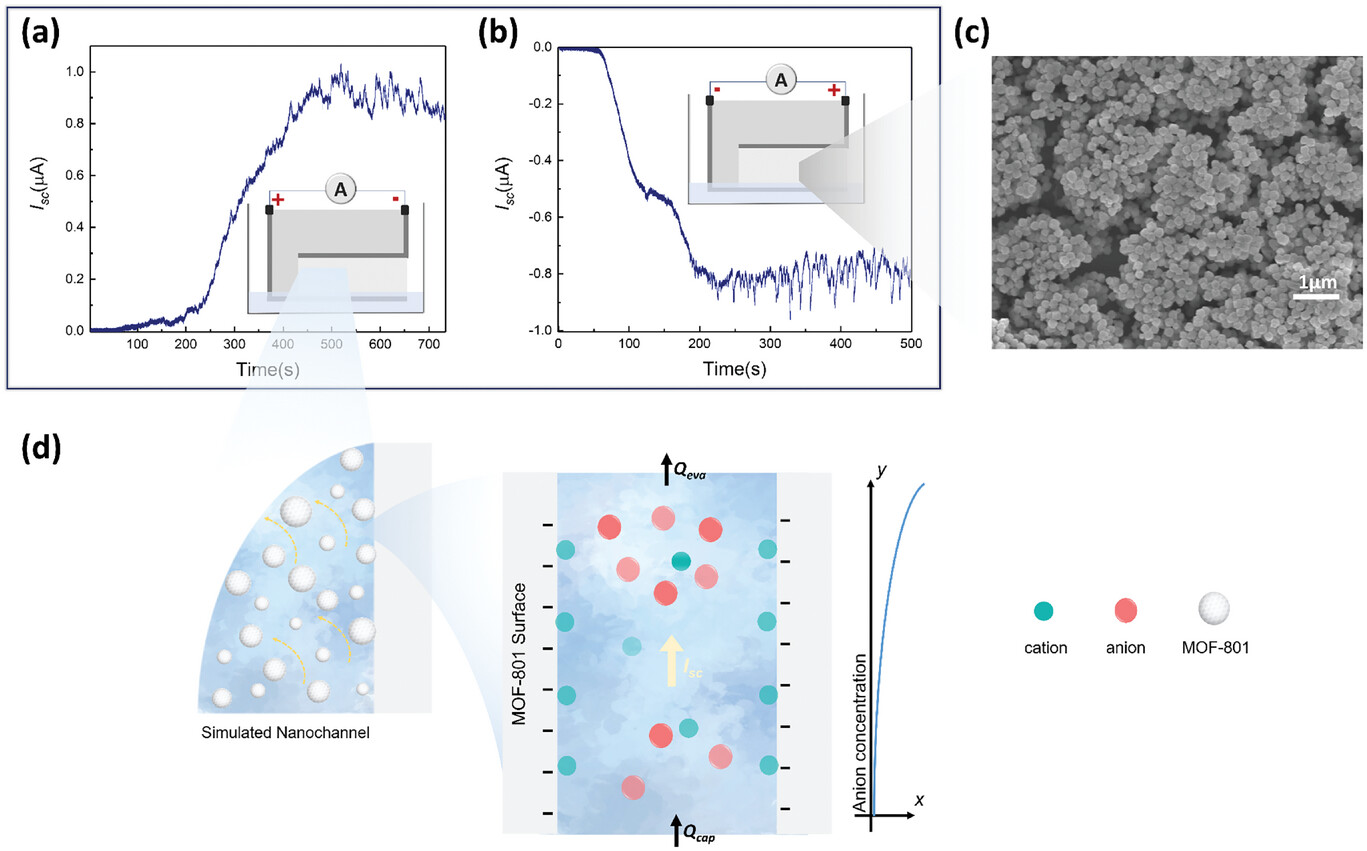 (1) 制备了基于MOF-801材料的蒸发诱导电生成器(MEIEG),并对其形貌、结构和化学性质进行了表征。