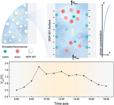 河南大学崔鹏&程纲老师等报道的本篇文章(Small 2024, 2400961)中研究了利用功能化纳米通道将环境热能转化为电能的过程。这一过程涉及固液界面与自然水蒸发之间的相互作用。蒸发驱动的水势效应是一种新型的绿色环境能源捕获技术,具有广泛的应用,并不依赖地理位置或环境条件,只要有水、光和热就能产生电能。然而,需要合适的材料和结构来利用这一自然过程进行发电。MOF材料是水蒸发发电的新兴领域,但仍然存在许多挑战。本研究使用具有高孔隙率、带电表面和亲水性的MOF-801来增强蒸发驱动发电的输出性能。它可以产生约2.2 V的开路电压和约1.9 µA的短路电流。这项工作具有简单的结构、易于制备、低成本和易得材料,以及良好的稳定性,在自然环境中可以稳定运行,具有很高的实用价值。