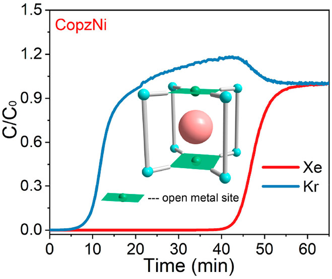 浙江大学鲍宗必团队发表的文章(Ind. Eng. Chem. Res. 2022, 61, 21, 7361–7369)研究了具有双可接近开放金属位点和合适孔径的M(pz)[Ni(CN)4] (简称MpzNi, M=Co, Ni, pz=吡嗪)金属有机框架材料用于Xe/Kr混合气体的分离。CopzNi表现出在20 kPa下高达2.49 mmol/g的Xe吸附量,以及在Xe/Kr (20/80)混合气体动态吸附中2.35 mmol/g的优异Xe捕获量,优于大多数已报道的材料。密度泛函理论计算进一步揭示,优异的分离性能源于紧凑的孔径和双开放金属位点提供的协同作用。