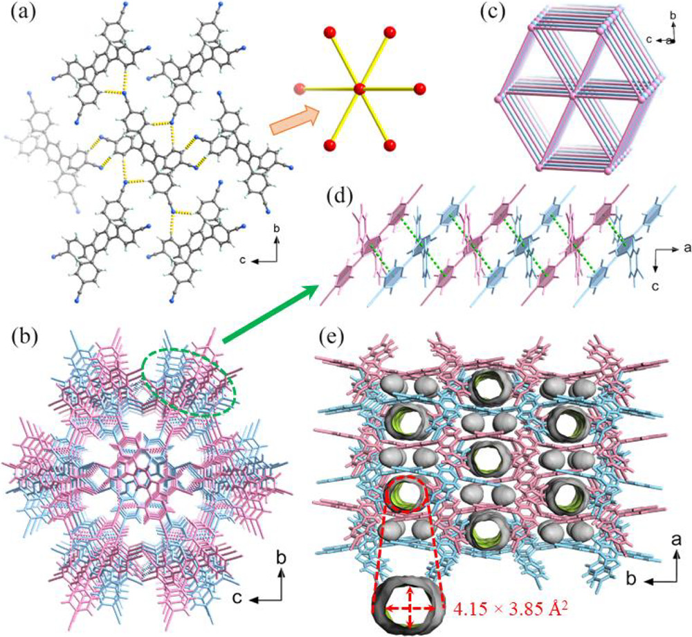 2)利用单晶X射线衍射(SCXRD)分析了HOF-40的晶体结构,发现它具有一维孔道结构,孔径约4.15 × 3.85 Å2。