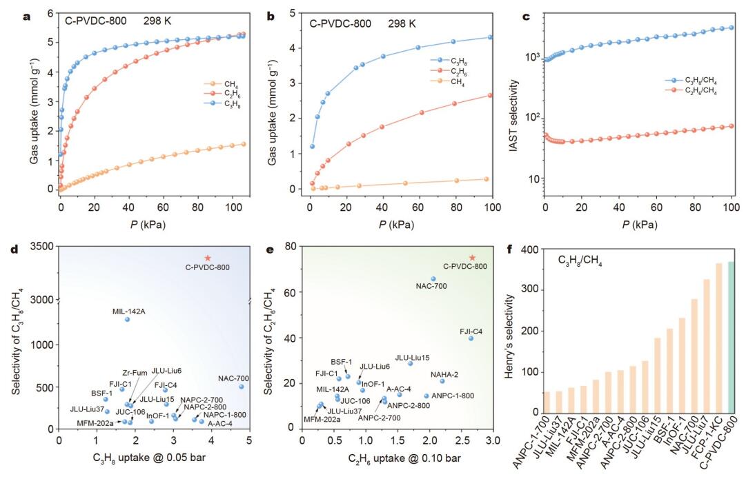 (2) 最佳C-PVDC-800在298K和100kPa下对丙烷/甲烷(50/50)和乙烷/甲烷(50/50)的IAST选择性分别高达3387和75,超过所有已报道吸附剂,树立了新的基准。丙烷/甲烷的亨利选择性也达到369的最高纪录。