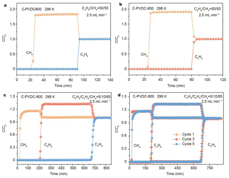 (2) 更重要的是,实现了轻烃分子的快速吸附动力学,突破实验进一步验证了其对轻烃混合物的出色分离性能。高吸附容量、快速吸附动力学、简便制备方法和稳健稳定性保证了该碳吸附剂在天然气净化和丙烷乙烷提取方面的广阔应用前景,在其他气体混合物分离中也有很大潜力。