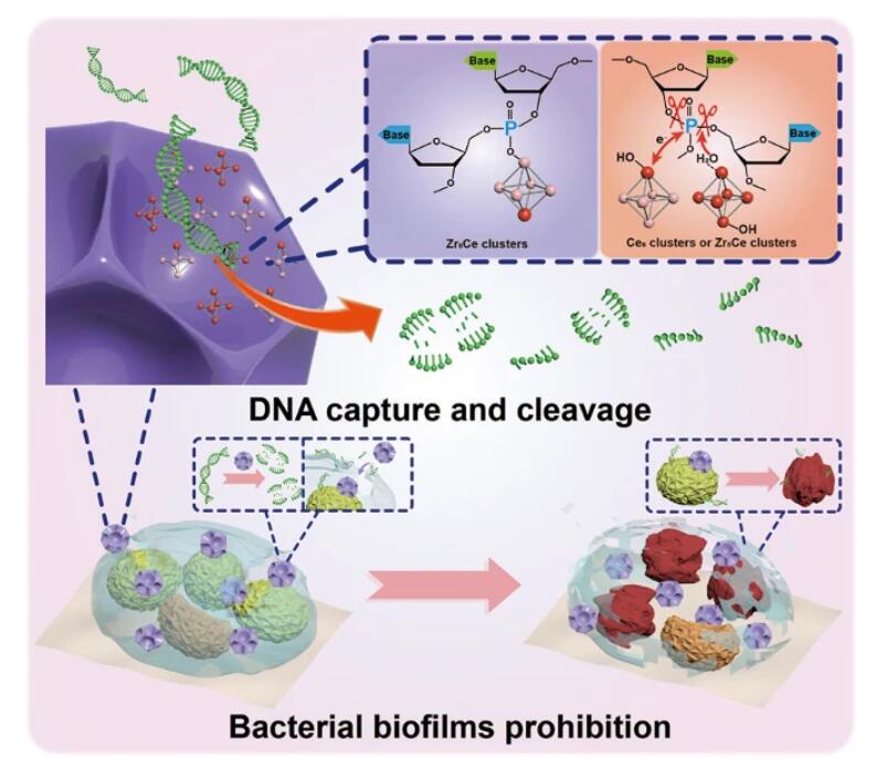 上述系统的表征和分析揭示了Zr-Ce双金属团簇的形成及其协同增强DNA水解活性的机制,为设计高效抗菌生物膜材料提供了重要依据。