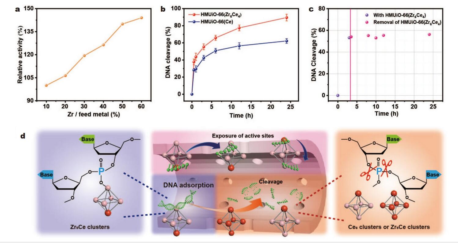 (2) Zr-Ce双金属MOF中Zr-OH和Ce-OH位点的协同作用,显著提高了DNA水解速率和持续性。