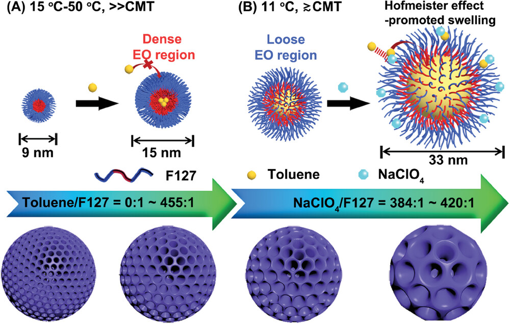 (3) 本文作者在前人工作的基础上,提出利用Hofmeister盐离子和低温微乳液的协同效应,实现MOFs中连续可调的大介孔。其中,F127形成胶束,甲苯作为溶胀剂。在低于临界微乳液温度(CMT)略高的温度下,大量甲苯可渗透进去,导致介孔显著扩张至33 nm左右。ClO4-离子的协同作用使介孔扩张程度得以连续控制。
