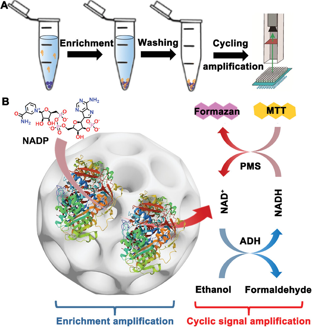 (3) 利用合成的HMUiO-66(Ce)作为平台,通过富集和循环放大策略,实现了对飞摩尔级碱性磷酸酶(ALP)的比色检测。其中,高达33 nm的大介孔不仅保证了ALP的富集,还为后续比色反应提供了足够空间。