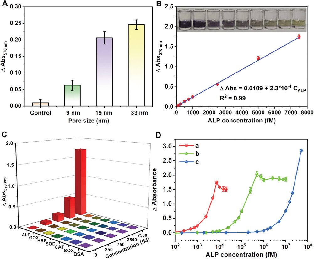 华东理工大学顾金楼团队发表的文章(Adv. Sci.2024,11, 2305786)提出了一种基于低温微乳液和Hofmeister离子协同效应的方法,用于制备具有可调节大介孔的分级介孔金属有机框架(HMMOFs)。低温显著提高了疏水性溶剂在微乳液核心中的溶解度,扩大了HMMOFs复制品中的介孔。同时,Hofmeister盐离子通过调节溶胀剂进入微乳液核心的渗透性,连续控制介孔的扩张。高达33 nm的大介孔为碱性磷酸酶(ALP)的富集提供了足够的空间,并保留了剩余的通道以促进自由质量扩散。利用这些优势,成功开发了一种基于富集和循环放大原理的大介孔HMMOFs比色传感器,用于飞摩尔级ALP检测。该传感器表现出100至7500 fm的线性检测范围和42 fm的检测限,比经典的对硝基苯磷酸盐比色法高出4000多倍。如此高的灵敏度突显了HMMOFs可调介孔结构在先进传感应用中的重要性,并预示了它们在诊断和生物医学研究中检测大分子的潜力。
