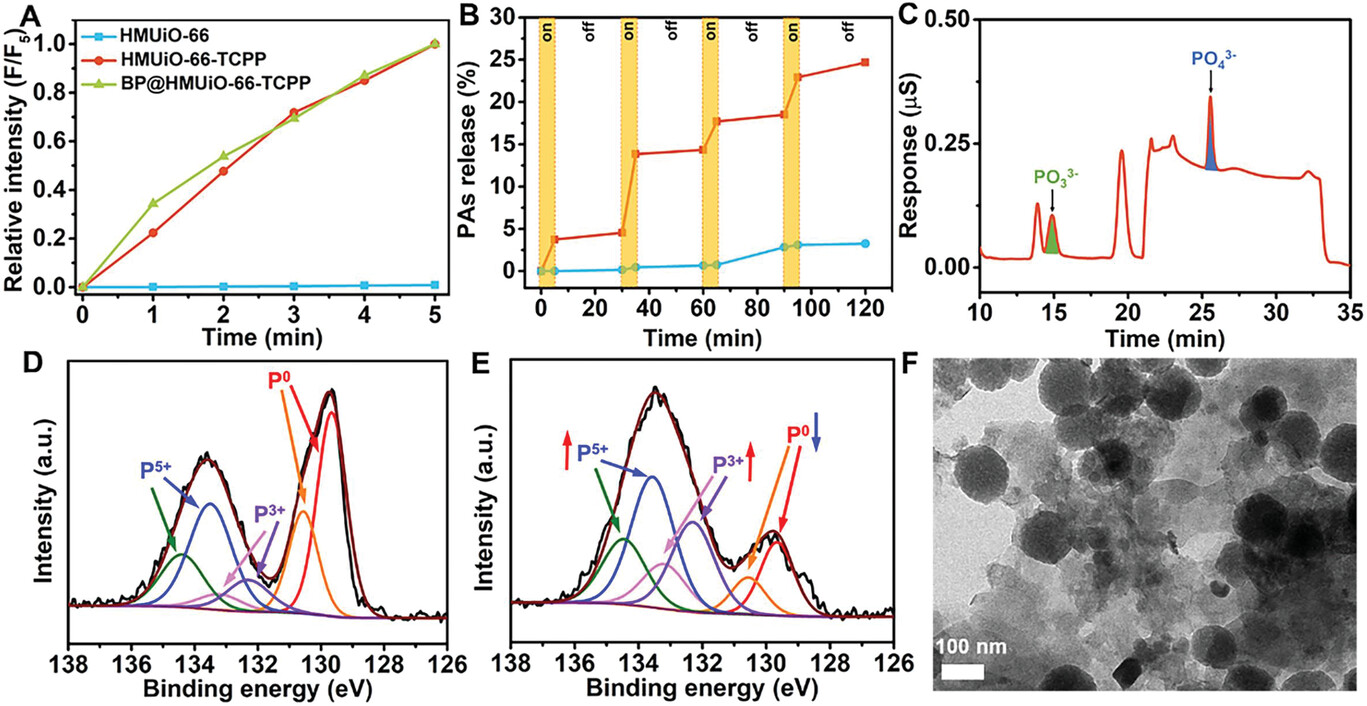 3)在660nm红光照射下,TCPP能够有效产生1O2,并快速扩散到介孔域中,诱导BPQDs降解释放PAs(主要为磷酸根和亚磷酸根离子)。该过程可在多个循环中被光控制开关。