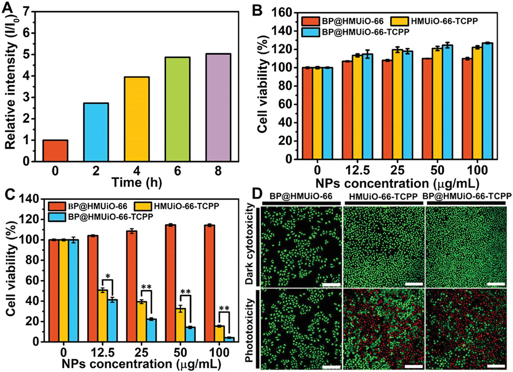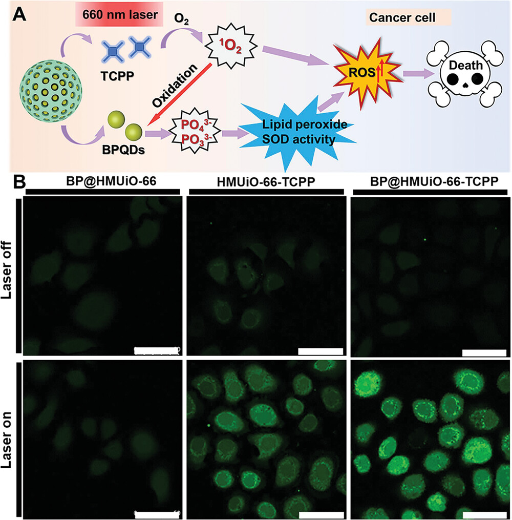 3)作者提出利用黑磷量子点(BPQDs)作为PAs供体,并将其与光敏剂TCPP整合在HMMOFs中。在光照条件下,TCPP产生的1O2能够诱导BPQDs降解释放PAs,实现PDT和IIT的协同疗效。HMMOFs的分级介孔结构能够分别负载BPQDs和TCPP,促进它们之间的协同作用。