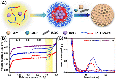 4)为进一步扩大孔径,作者采用了高分子量的两亲性PEO-b-PS嵌段共聚物作为软模板,并引入1,3,5-三甲基苯作为膨胀剂,实现了可调节的大孔MOF结构。