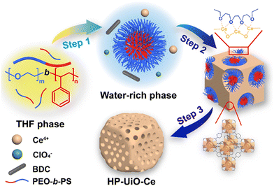 本文介绍了首次采用聚(乙烯氧化物)-b-聚苯乙烯(PEO-b-PS)嵌段共聚物作为模板,合成具有分级多孔结构的铈基金属有机骨架(MOF)。通过Hofmeister离子和软模板的协同作用,在水相中制备出介孔尺寸约15nm的UiO-66型铈MOF。进一步引入1,3,5-三甲基苯与PEO-b-PS胶束核心相互作用,可将介孔尺寸调节至约23nm。