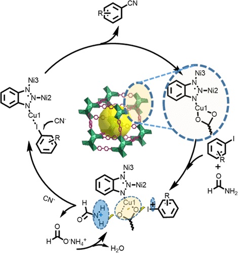 清华大学胡憾石&南开大学赵斌老师等人报道的本篇文章(J. Am. Chem. Soc. 2024)中报道了一种新型的由[Ni72]纳米笼组装而成的三维框架材料1,该材料具有优异的溶剂和pH稳定性。为了探究催化性能的构效关系,通过向框架1中掺杂Cu2+制备了几种具有不同Ni/Cu摩尔比的同构MOFs材料(Ni0.59Cu0.41 (2), Ni0.81Cu0.19 (3), Ni0.88Cu0.12 (4), 和 Ni0.92Cu0.08 (5))。催化研究表明,催化剂3在利用甲酰胺替代剧毒NaCN/KCN合成芳香腈方面表现出优异的性能,TOF值高达9.8 h-1。此外,催化剂3在克级规模实验中展现了实用性,并且由于Ni中心与配体之间显著的静电和轨道相互作用以及DFT计算支持的较大SOMO-LUMO能隙,使其具有高稳定性,在六次循环后仍能保持催化活性。对照实验和DFT计算进一步揭示催化剂3优异的催化性能源于Ni/Cu的协同效应。重要的是,这项工作不仅提供了一种构建含有多核纳米笼且具有优异催化性能的高度稳定MOFs的可行方法,而且首次报道了以甲酰胺为氰源合成芳香腈的多相催化剂。