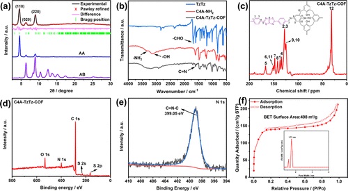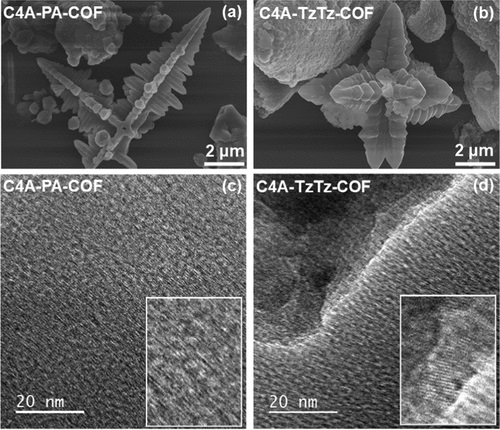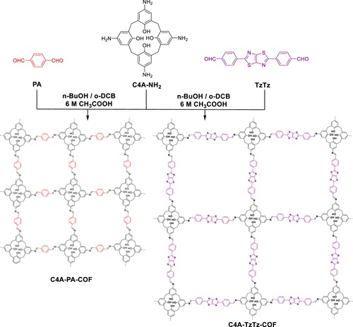 (1) 通过席夫碱缩合反应,合成了两种C4A-COFs:以对苯二甲醛(PA)为连接基的C4A-PA-COF(无D-A结构)和以4,4’-(噻唑并[5,4-d]噻唑-2,5-二基)二苯甲醛(TzTz)为连接基的C4A-TzTz-COF(具D-A结构)。