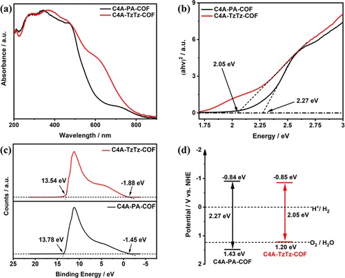 (1) 成功构建了具D-A结构的高结晶性、大比表面积的C4A-TzTz-COF,其光催化产氢性能显著优于无D-A结构的C4A-PA-COF。