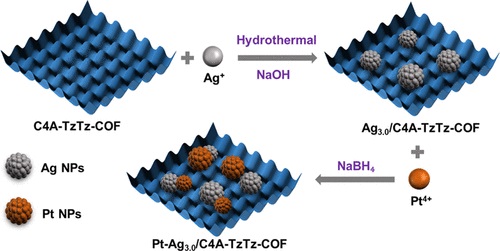 (2) 采用热还原法在C4A-TzTz-COF表面沉积不同含量的Ag纳米颗粒,制得Agx/C4A-TzTz-COF;再通过硼氢化钠还原法在其表面沉积Pt纳米颗粒,制得Pt-Ag3.0/C4A-TzTz-COF。