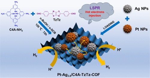 (3) 在C4A-TzTz-COF表面引入Ag-Pt双金属助催化剂,Ag纳米颗粒提供等离子体热电子,Pt纳米颗粒捕获热电子还原产氢,二者协同促进了D-A COF的电荷分离和转移。