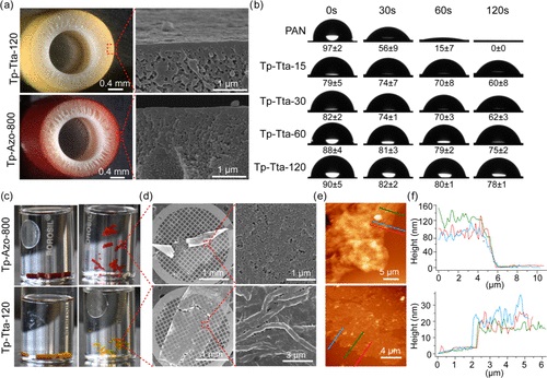 (5)扫描电镜(SEM)和原子力显微镜(AFM)表征了COF膜的表面形貌和膜厚。Tp-Tta-120和Tp-Azo-800膜的厚度分别约为20nm和100nm。