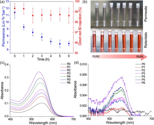 (7)纳滤性能测试:COF膜对有机染料(如DR-80)表现出优异的99%拒绝率,主要取决于溶质分子尺寸而非分子量。随着前驱体浓度增加,膜的渗透率降低而拒绝率提高。